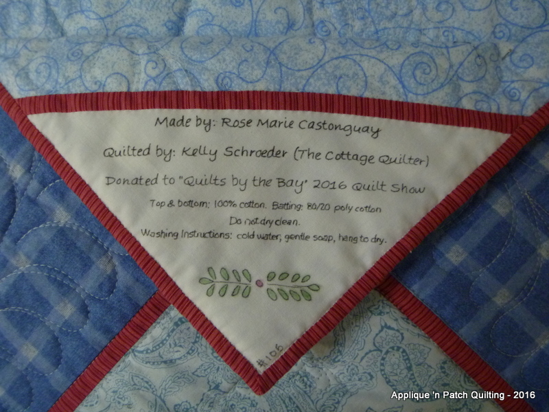 The label. The label looks crooked here and I tried to take another shot. As soon as I put it down on the coffee table, Miss Ashes was on the sofa looking on and immediately came over. So, no second photo. I don't want any cat hairs on this quilt since it is being donated.